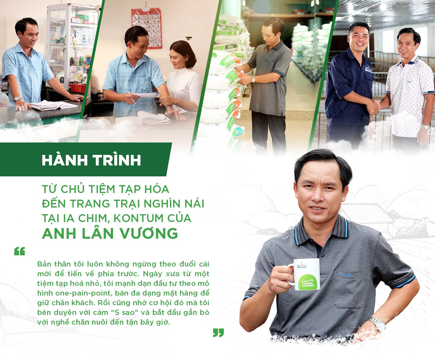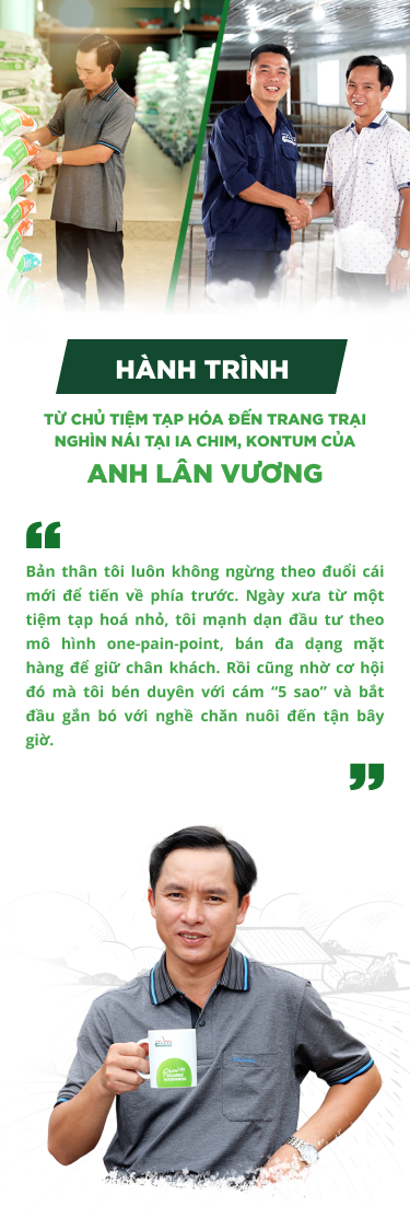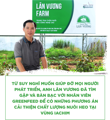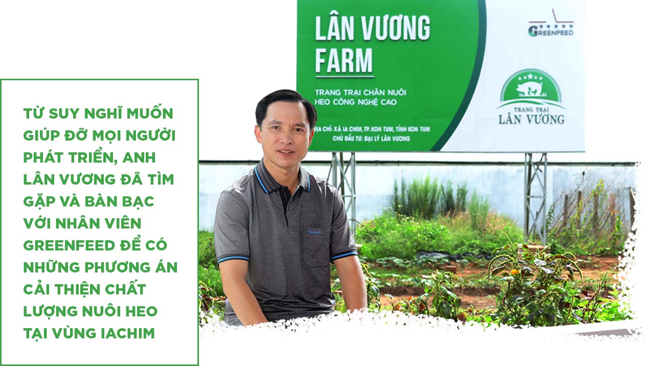 Gắn bó với GreenFeed từ năm 2012, anh Lân Vương tiên phong mang mô hình chăn nuôi về khu vực Iachim (Kontum) và ứng dụng thành công với quy mô chuồng trại lên đến 1000 nái, 2400 thịt. Cùng GREENFEED, anh Lân Vương đã từng bước đưa mô hình chăn nuôi vùng Iachim từ lạc hậu đến hiện đại, nâng tầm cuộc sống của bà con địa phương.