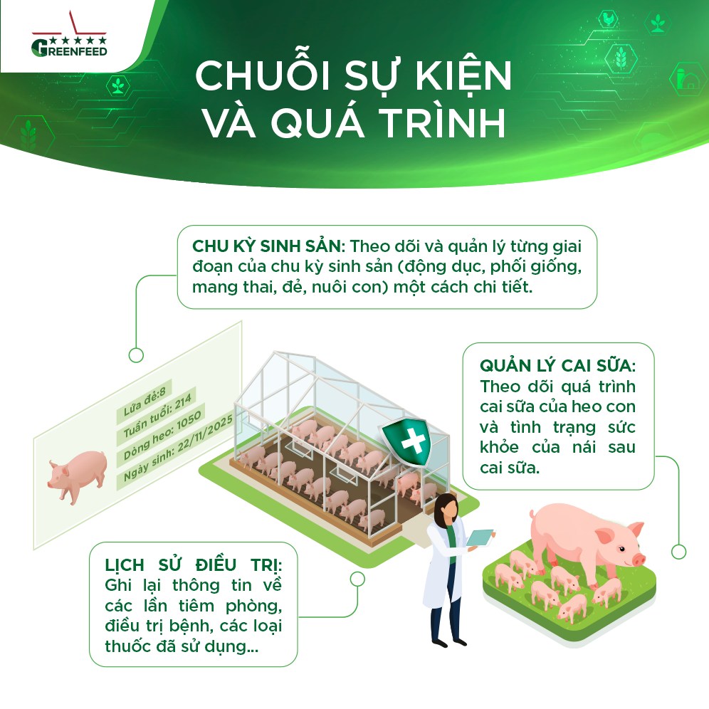 Hệ thống hỗ trợ quản lý toàn bộ chu kỳ sinh sản: động dục, phối giống, mang thai, đẻ, cai sữa, nuôi con. Đồng thời ghi nhận lịch sử điều trị, giúp đánh giá chính xác hiệu quả chăn nuôi và tình trạng đàn nái sau mỗi giai đoạn.
