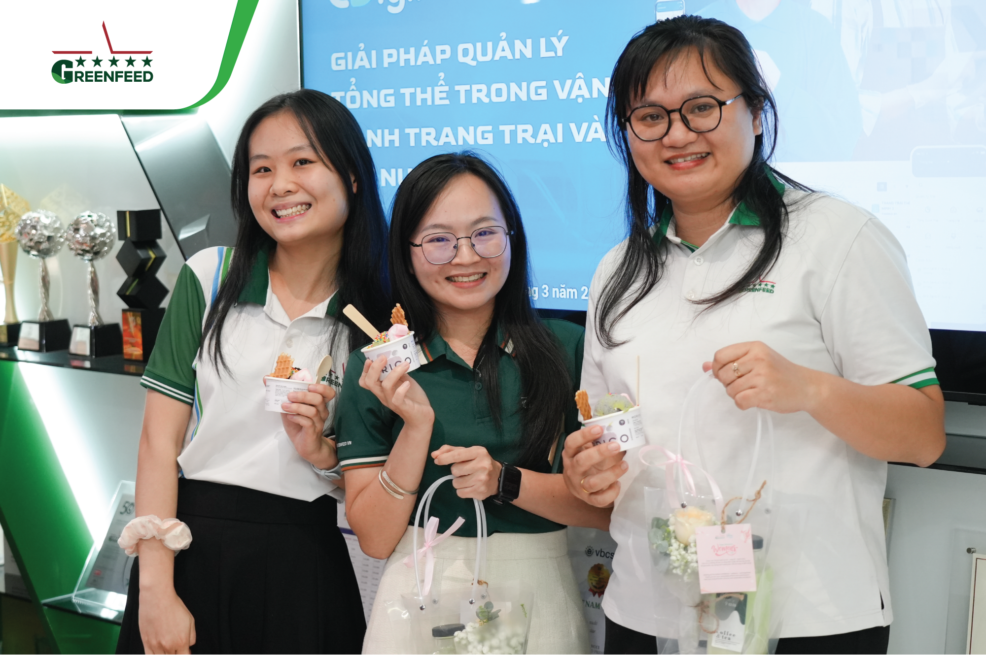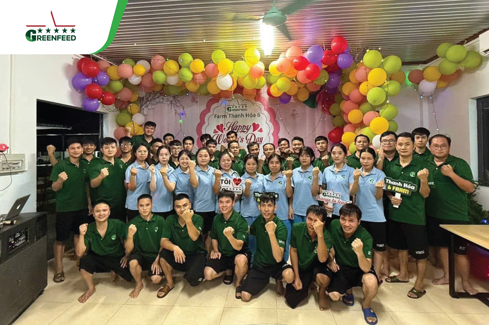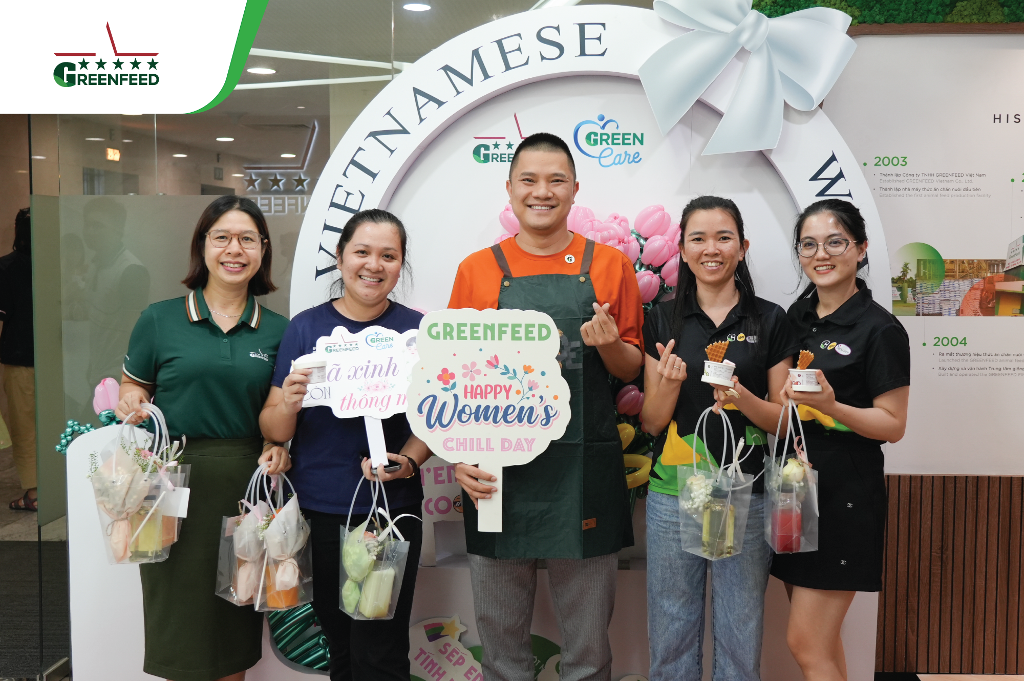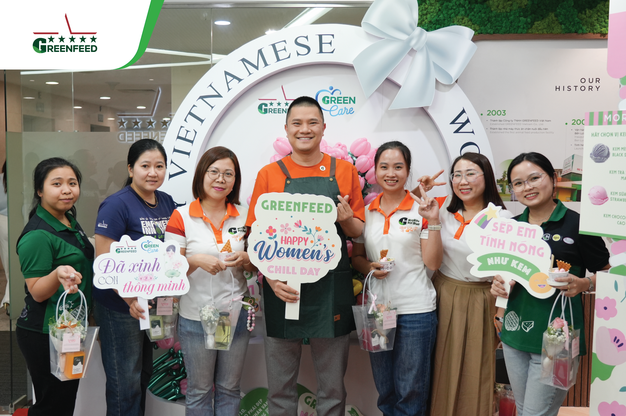 At the head office, our male leaders and GREENFEEDERS set aside their daily work, put on aprons to serve ice cream and hand out flowers to their female colleagues. Meanwhile, across all sites, workspaces came alive with vibrant decorations, loving messages, and thoughtfully prepared gifts — each carrying a touch of appreciation for GREENFEED’s incredible female warriors.