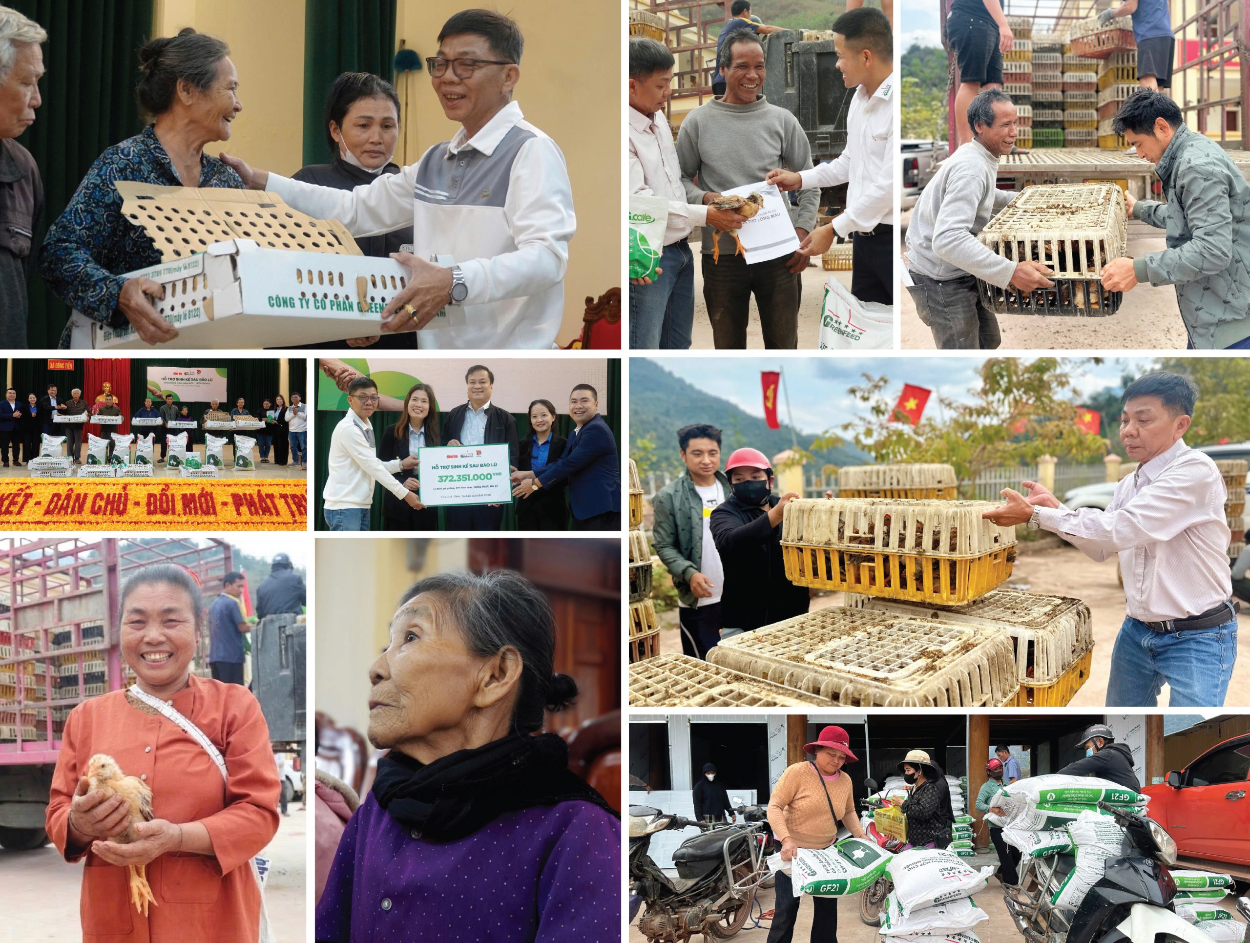 Trong các ngày 12 và 13/03/2026, GREENFEED đã nhanh chóng có mặt tại Hà Tĩnh và Nghệ An để trao sinh kế cho bà con trong khuôn khổ chương trình hỗ trợ sau bão lũ. Cụ thể, tại Hà Tĩnh, chương trình gửi trao 7.500 con gà giống, 810 bao thức ăn chăn nuôi cùng 120 kg thuốc thú y, tổng giá trị hơn 372 triệu đồng. Tiếp đó, tại Nghệ An, bà con nhận được 7.500 con gà giống, 240 bao thức ăn chăn nuôi cùng 30 kg thuốc thú y, tổng giá trị hơn 455 triệu đồng.