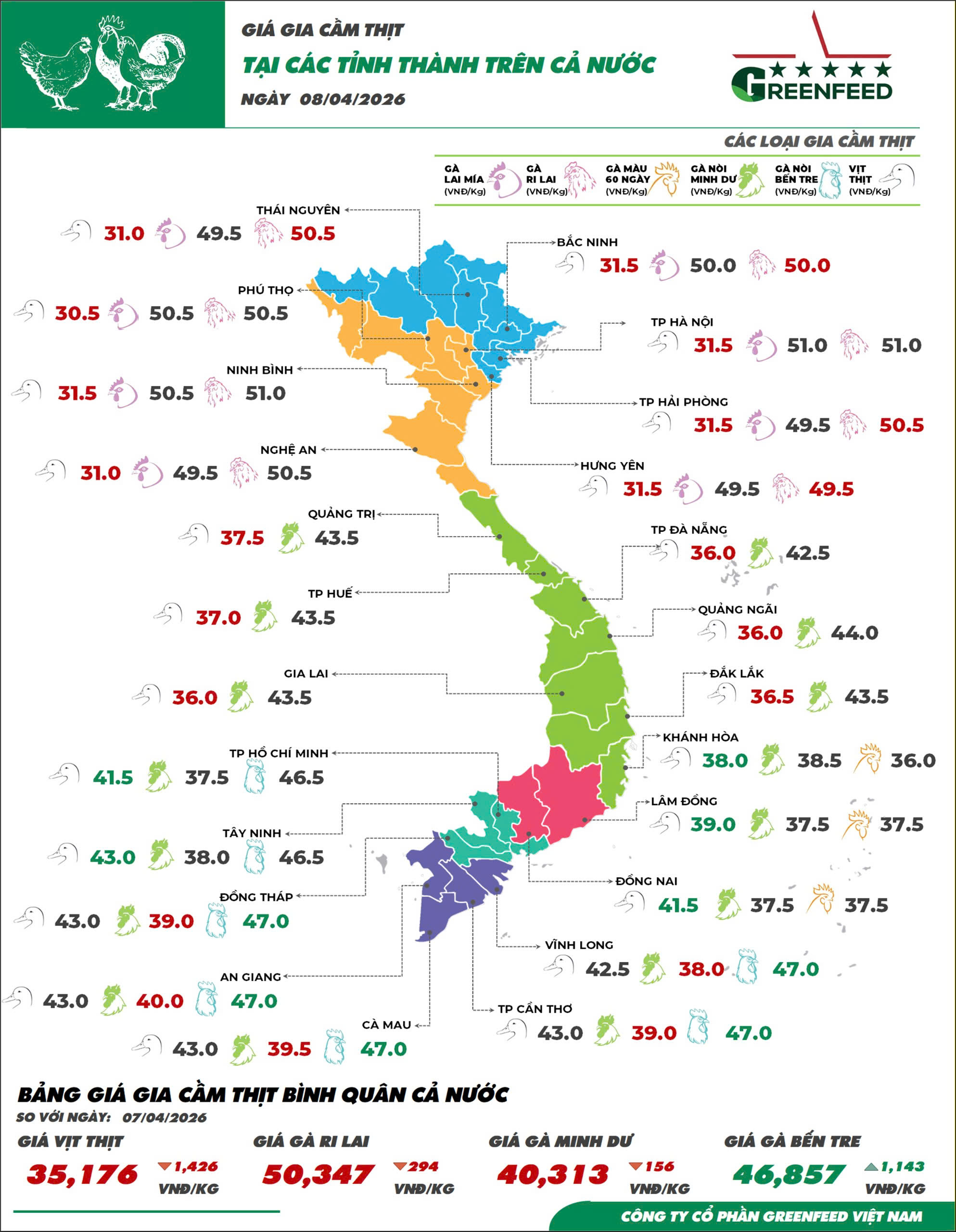 Giá gà Minh Dư ngày 07/04 ghi nhận giảm nhẹ tại khu vực Phía Nam. Theo đó các tỉnh Tây Nam Bộ giảm nhẹ 500 VNĐ/Kg tại một số tỉnh, về quanh mức 39.000 – 40.000 VNĐ/Kg. Đông Nam Bộ không ghi nhận biến động giá trong ngày 08/04, giá thu mua gà Minh Dư trên địa bàn nằm trong khoảng 37.000 – 38.000 VNĐ/Kg. Khu vực Miền Trung tiếp tục giữ giá trong hôm nay nay hiện giao động trong khoảng 43.000 – 44.000 VNĐ/Kg.