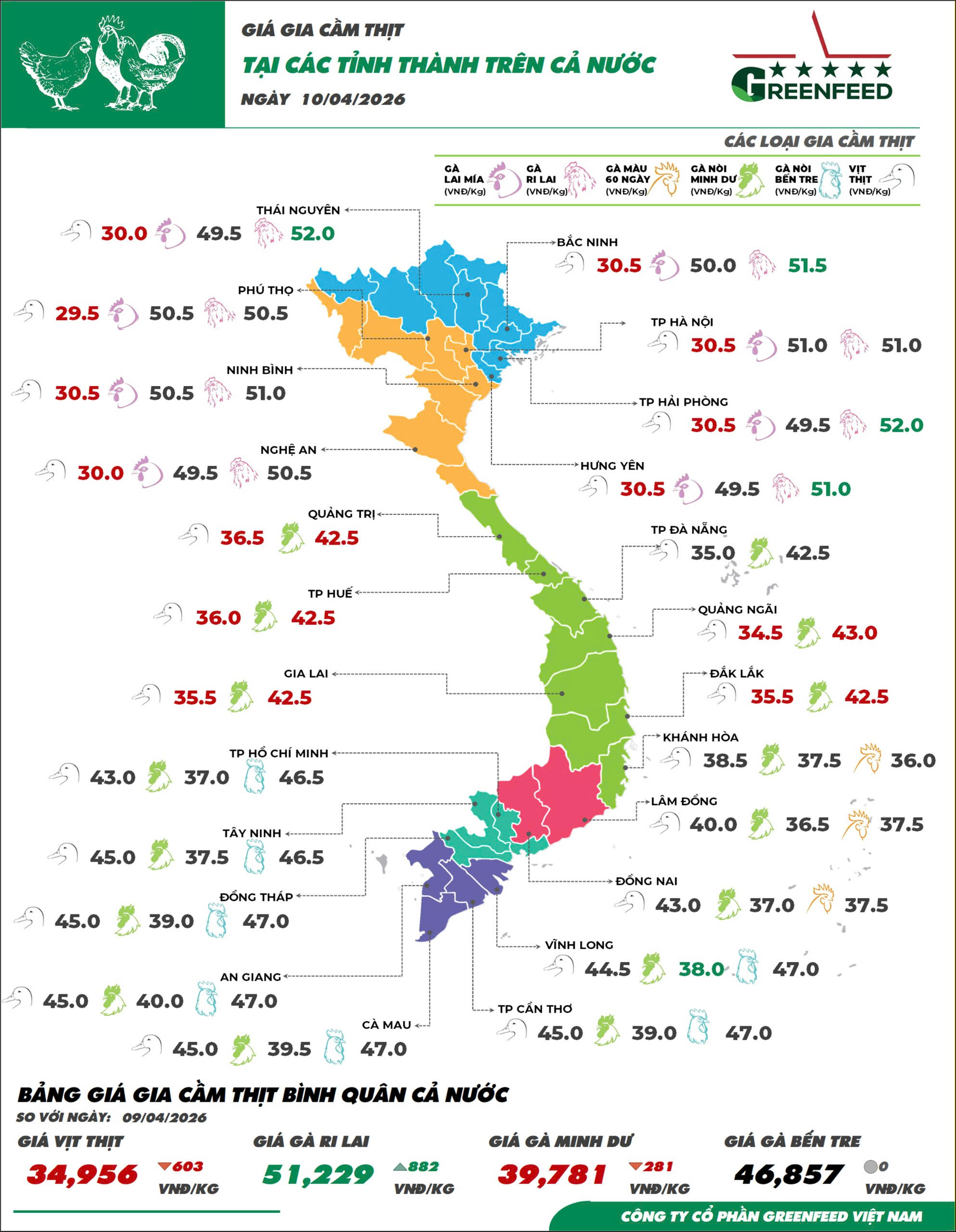 Giá gà Minh Dư ngày 10/04 giả nhẹ tại các tỉnh Miền Trung. Theo đó giá gà Minh Dư khu vực Miền Trung ghi nhận giảm khoảng 1.000 VNĐ/Kg hiện còn 42.500 – 43.000 VNĐ/Kg. Khu vực Miền Nam không ghi nhận biến động trong ngày 10/04, các thương lái đang thu mua trong khoảng 36.500 – 37.500 VNĐ/Kg tại Đông Nam Bộ và 39.000 – 40.000 VNĐ/Kg tại Tây Nam Bộ.