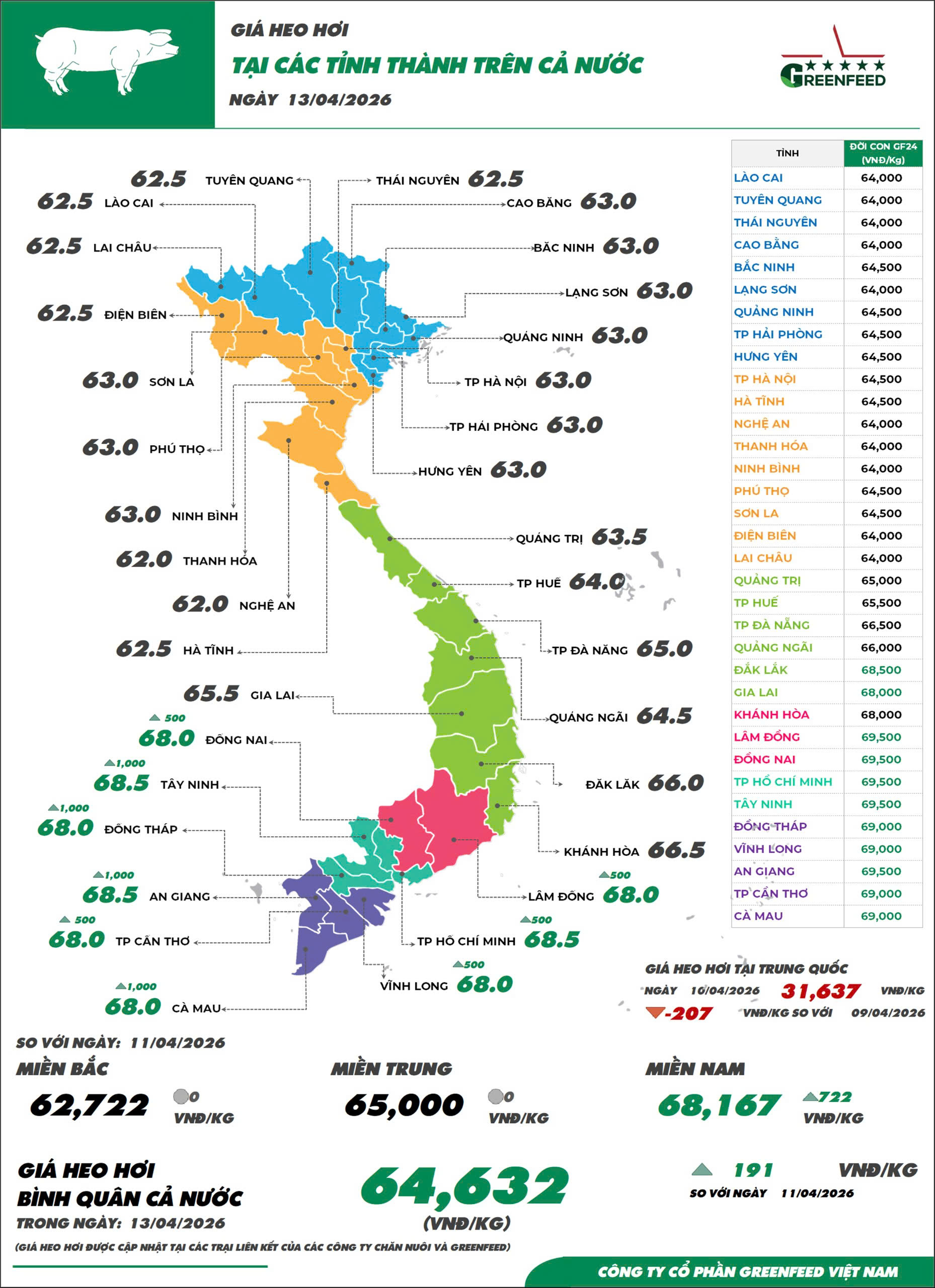 Khu vực miền Bắc: giá heo hơi tiếp tục giữ giá trong ngày 13/04, mặt bằng giá toàn khu vực hiện giữ ở mức 62.000 – 63.000 VNĐ/Kg, mức giá này cao hơn gần 500 VNĐ/Kg so với mức được ghi nhận cùng thời điểm tuần trước.
