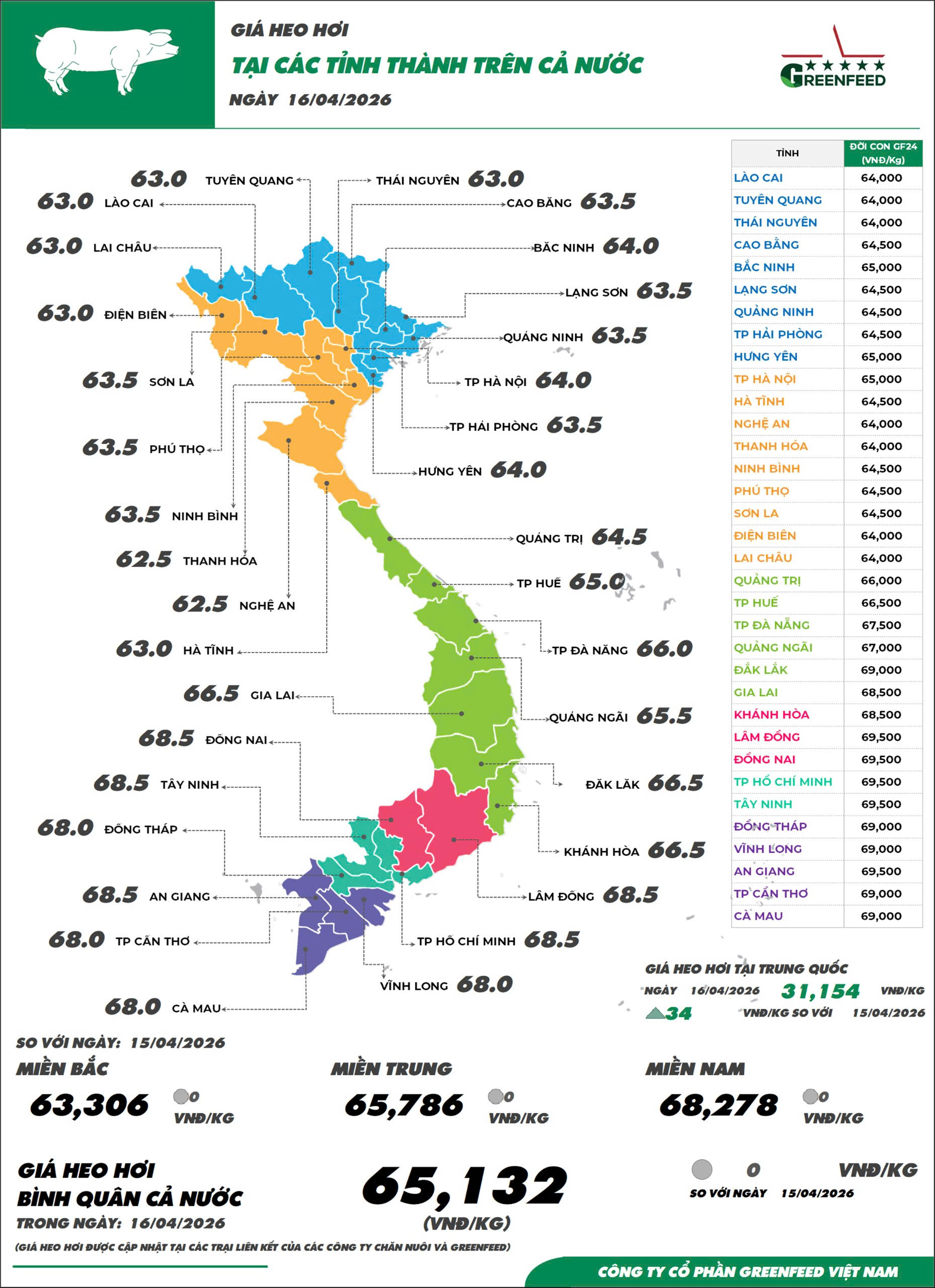 Giá heo hơi hôm nay 16/04 tiếp tục đi ngang trên cả 3 miền, theo đó heo hơi đang được mua bán trong khoảng 62.500 – 68.500 VNĐ/Kg, tăng gần 1.000 VNĐ/Kg so với tuần trước, trong đó Miền Nam vẫn là khu vực có mức giá cao nhất cả nước.