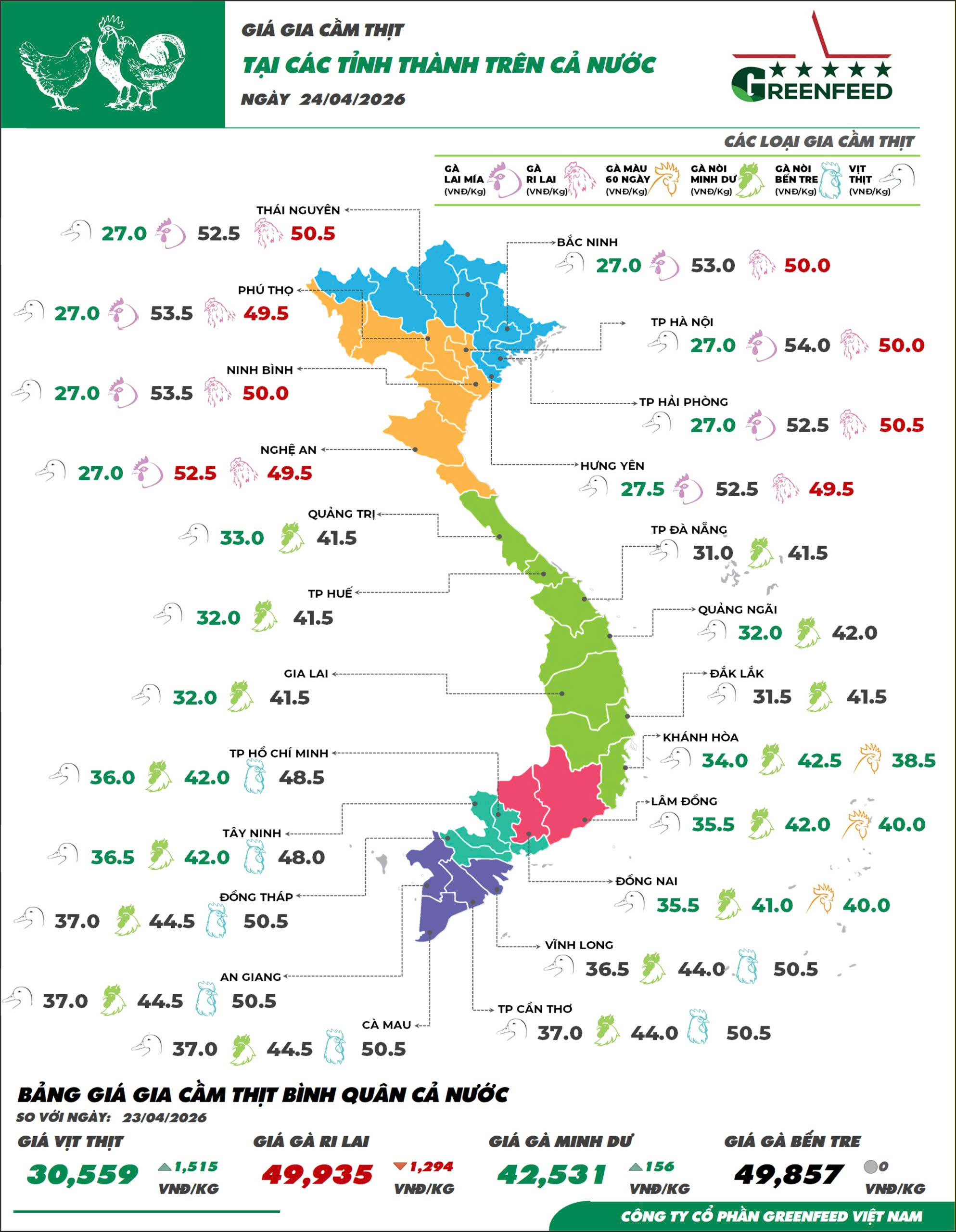 Giá gà Minh Dư ghi nhận những diễn biến tích cực trong ngày 24/04. Miền Trung giữ giá trong hôm nay, bình quân toàn khu vực hiện đạt 41.000 – 42.000 VNĐ/kg. Đông Nam Bộ tiếp tục đà tăng, mức tăng được ghi nhận khoảng 500 VNĐ/Kg đạt mức 41.000 – 42.500 VNĐ/Kg. Tại Tây Nam Bộ giữ giá trong hôm nay, hiện đạt mức 44.000 – 45.000 VNĐ/Kg.