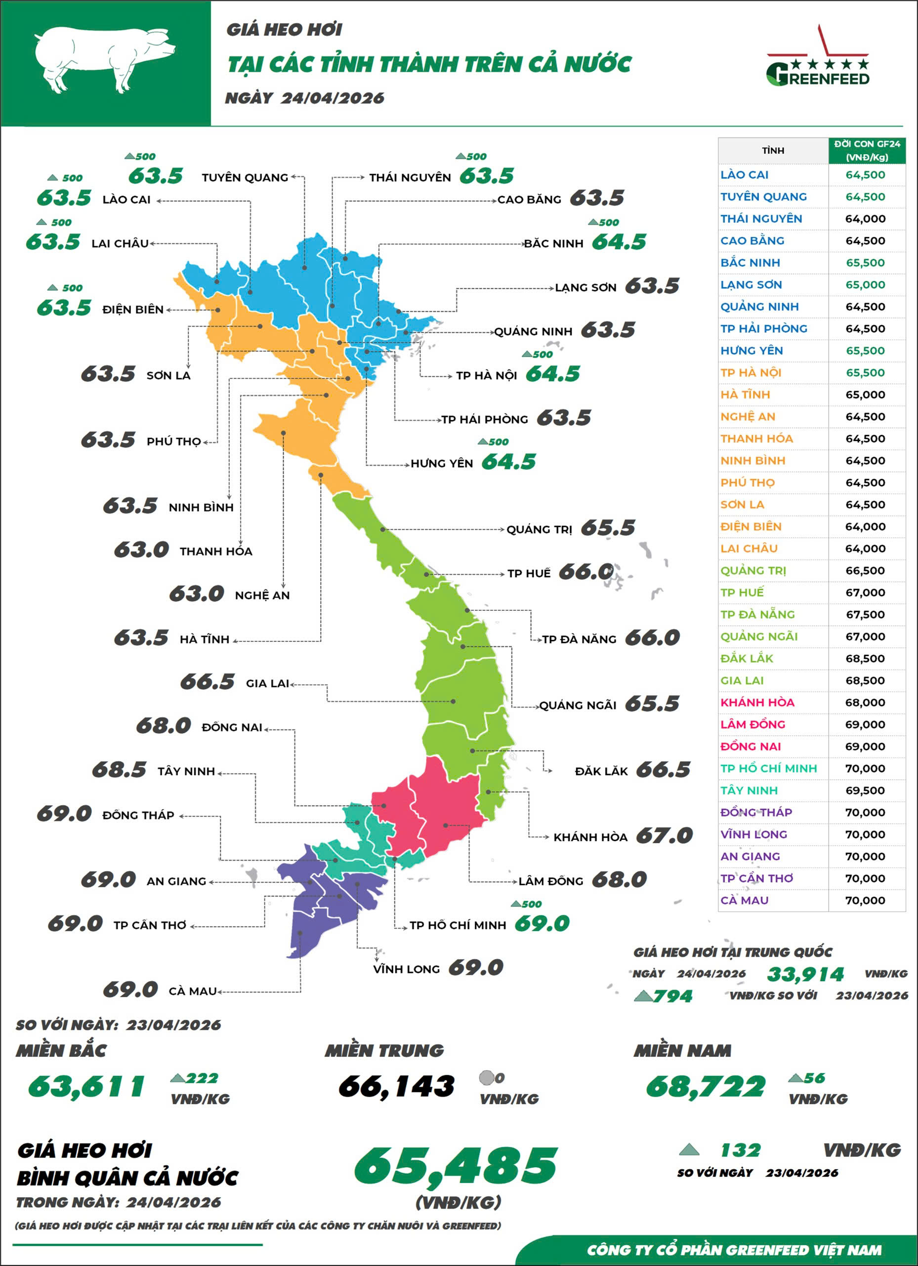 Khu vực miền Nam: giá heo hơi ngày 24/04 ghi nhận tăng 500 VNĐ/Kg tại TP Hồ Chí Minh, các thương lái hiện đang thu mua heo trong khoảng 68.000 – 69.000 VNĐ/Kg, mức giá này vẫn cao hơn gần 500 VNĐ/Kg so với tuần trước.