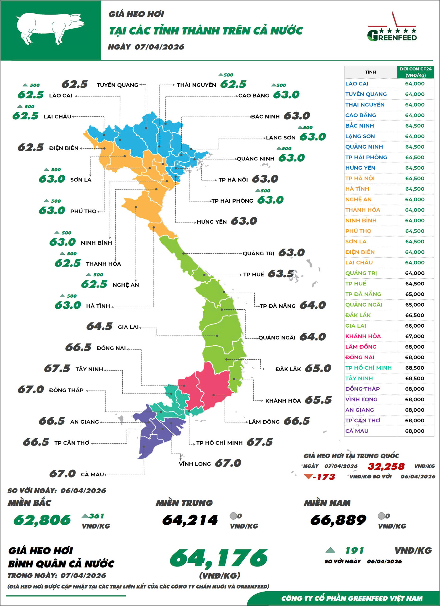 Pork prices on April 7th saw an increase in some provinces in the Northern region, while other areas remained relatively unchanged compared to the previous trading session. Market prices are currently fluctuating between 62,500 and 67,500 VND/kg, an increase of 200 VND/kg compared to April 6th and approximately 500 VND/kg higher than last week.